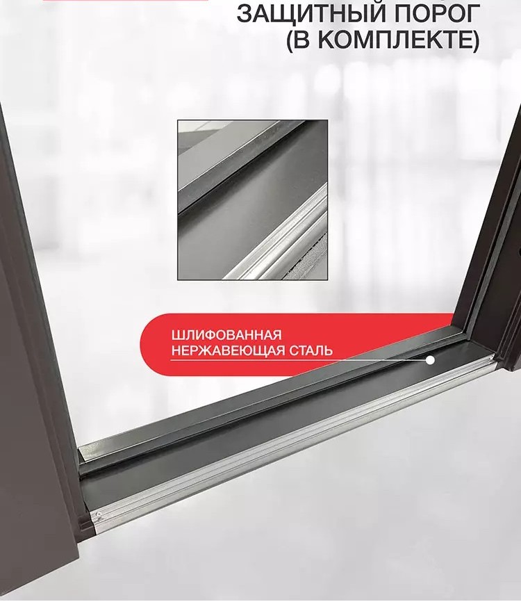 Цельногнутая из стали 1,5мм, нержавеющий порог, широкий наличник 100мм.