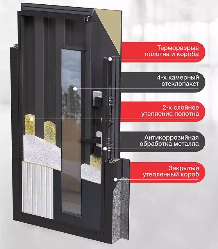 «Терморазрыв» обеспечивается наличием полиамидного профиля шириной 7 мм,  имеющий низкий коэффициент  теплопроводности. Полиамидный профиль расположен  по всему периметру дверного полотна и дверной коробки.