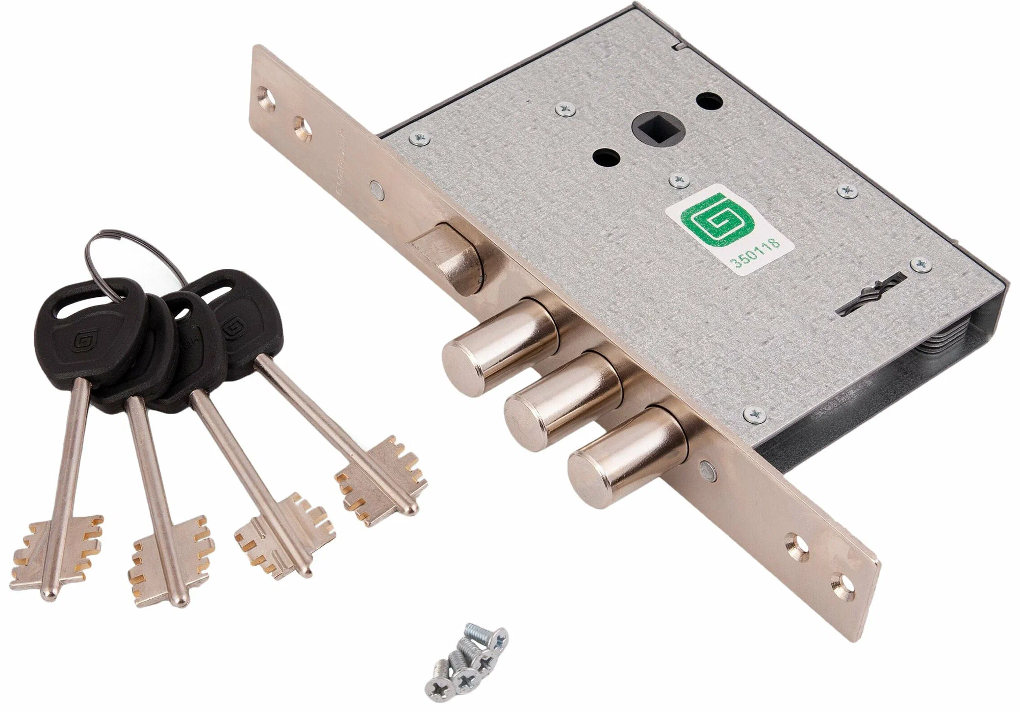 Врезной, сувальдный, 8 сувальд. 3 ригеля диаметром 15,8 мм, вылет - 26 мм. 2 класс (ГОСТ 5089-2011), более 1,6 млн комбинаций. В комплекте 4 ключа