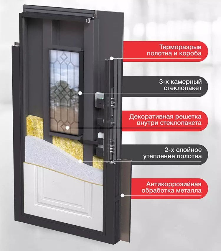 «Терморазрыв» обеспечивается наличием полиамидного профиля шириной 7 мм,  имеющий низкий коэффициент  теплопроводности. Полиамидный профиль расположен  по всему периметру дверного полотна и дверной коробки.